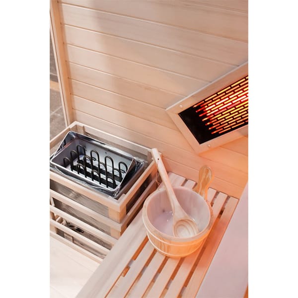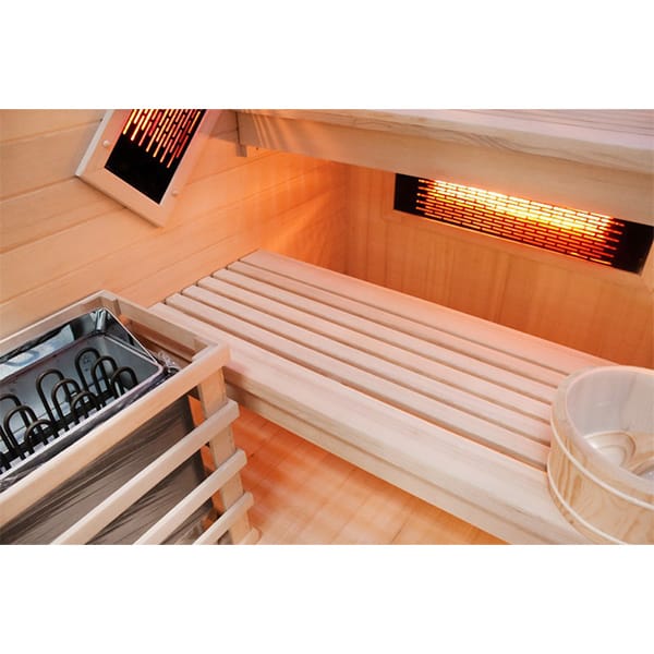 Dual Heat Technology combining infrared light heating and a traditional sauna stove.