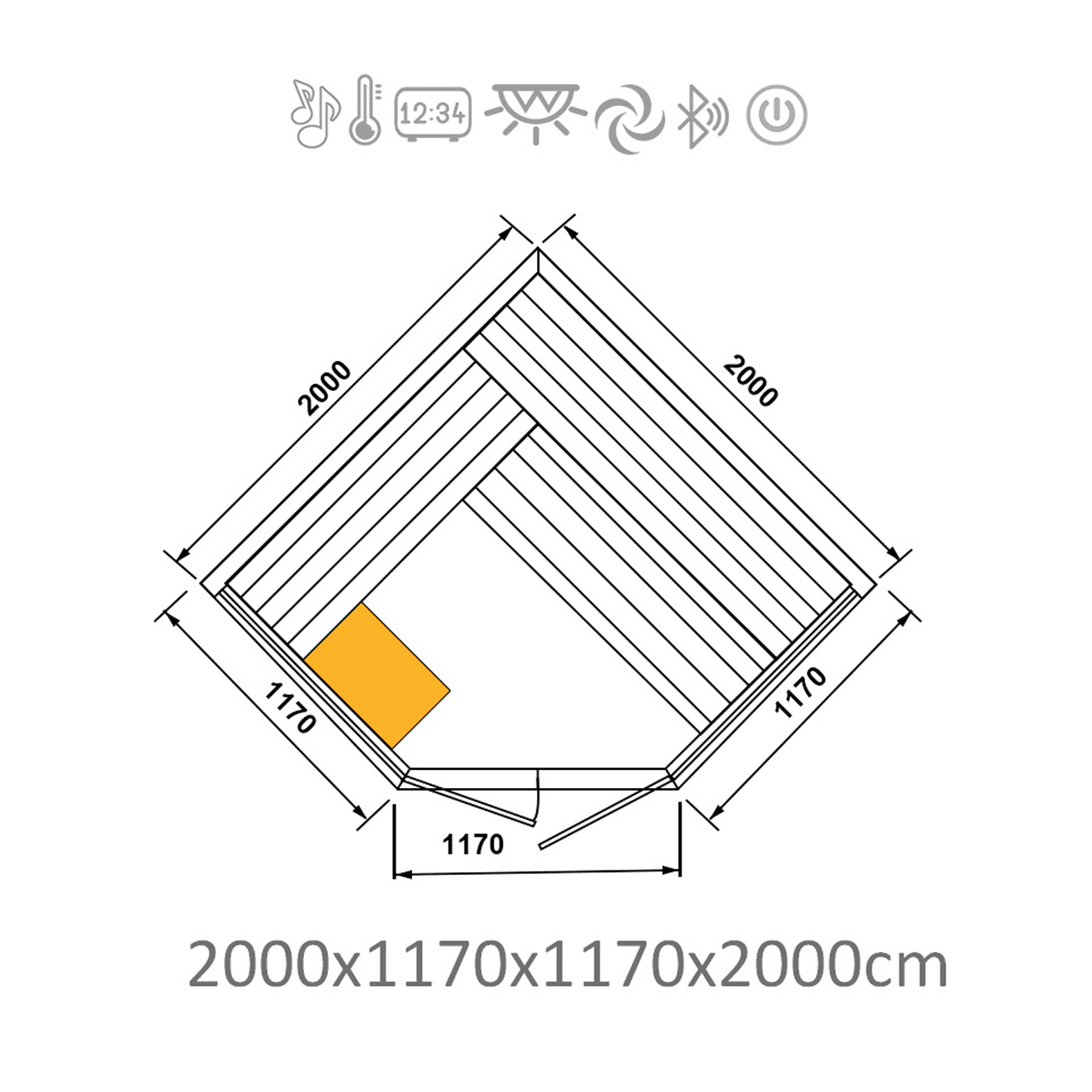 Size: 1170mm (W) x 1170mm (W2) x 2000mm (D) x 2000mm (H)