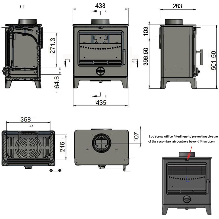 - Full cast construction of stove body and door
