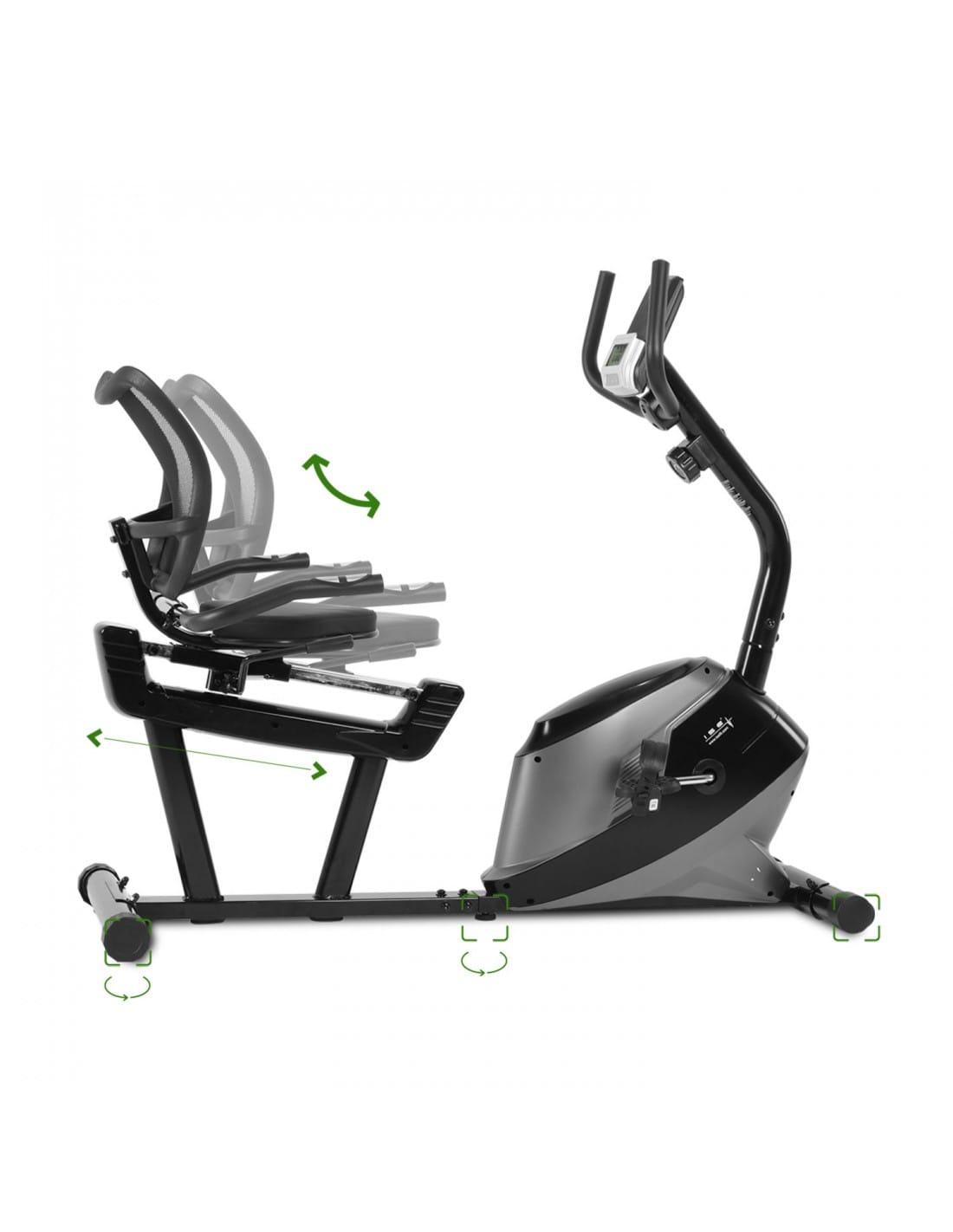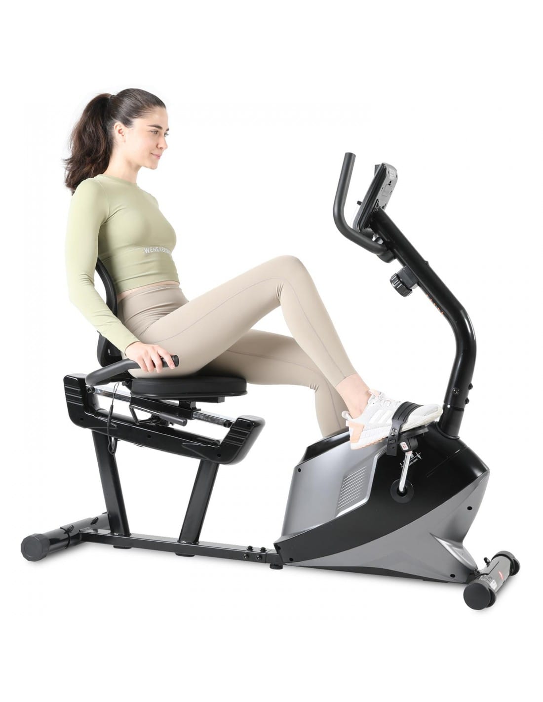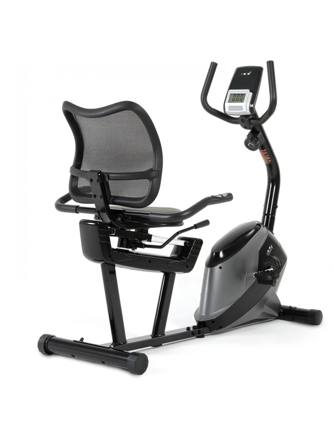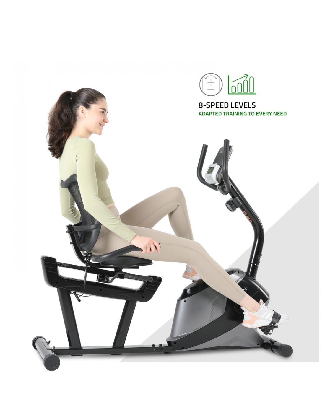 The recumbent magnetic exercise bike with 8 resistance levels is designed to deliver smooth and comfortable indoor cycling. The supportive seat and backrest allow riders to maintain a relaxed posture while training, while the front-mounted flywheel helps create consistent pedalling motion. The low step-through frame makes mounting and dismounting easy, making it a practical choice for regular home cardio sessions.